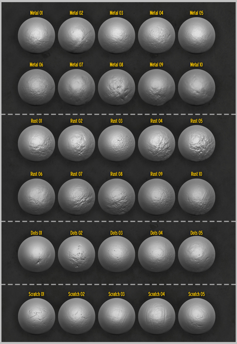 Metal Surfaces Brushes and alpha set for Zbrush, brushes and height/alpha maps, all 2048x2048.