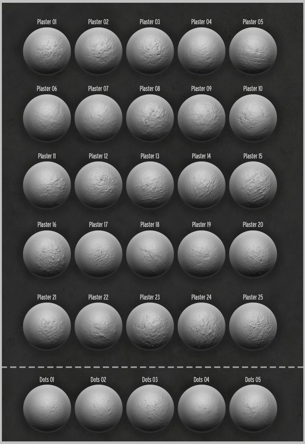 Plaster/Concrete Brush and alpha set for Zbrush, 30 brushes and height/alpha maps, all 2048x2048.
